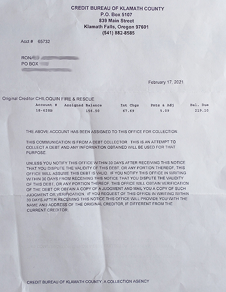 Years after I lost everything because of the accident and was living in my truck, Chiloquin Fire & Rescue continued to run their scam and try to get a couple hundred bucks out of a homeless veteran.